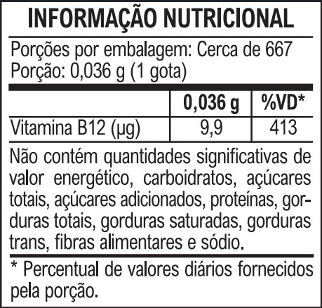 - Alta concentração de vitamina B12 por gota (0,036 g) = 9,9 mcg de vitamina B12;
